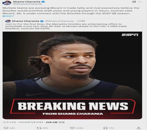 2025年休赛期,灰熊5年2.4亿美元续约小贾伦-杰克逊。莫兰特也有提前续约资格,最多能签2年1.284亿美元。当时莫兰特一边恭喜3J拿到大合同,一边表态希望自己也能续约。但是,灰熊并没有给莫兰特提供续约合同。
